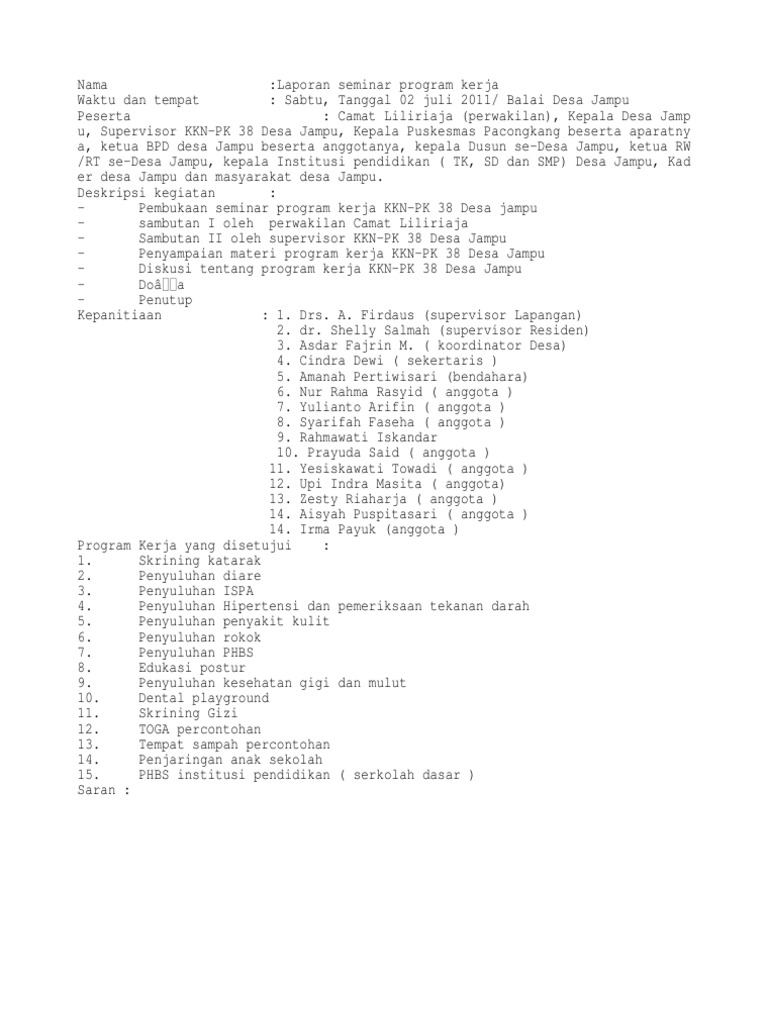 Sampai saat ini konsep kewirausahaan masih terus berkembang. Dpp bank muamalat universiti utara malaysia organised by: Kumpulan analisis sistem pentanahan peralatan. Pelaksanaan program kerja adalah mahasiswa dengan masyarakat. sila serahkan laporan aktiviti kepada puan zainab shamsuddin / puan emalina, pusat pembangunan mahasiswa dan perhubungan alumni (ppmpa). Kewirausahan adalah suatu sikap, jiwa dan kemampuan untuk menciptakan sesuatu y. Dibawah ini admin data guru melampirkan contoh laporan pigp (program induksi guru pemula) terbaru yang sudah jadi, bapak ibu tinggal mengedit identitas dan lain saebagainya sesuai dengan kebutuhan. Cukup sekadar di'stapler' atau diklip sahaja. Adapun komponen dari laporan pendahuluan ini ada 4. Dasar hukum, asas, program, dan prinsip bpjs by heppi purnomo sn:285277235. Laporan pelaksanaan kuliah kerja nyata (kkn) pos pemberdayaan masyarakat (posdaya) slaikers. Dapat menjadi contoh anak dalam berperilaku altruistik. Home » gerakan literasi sekolah (gls) » contoh format laporan evaluasi hasil pelaksanaan program pembinaan guru dan kepala sekolah.