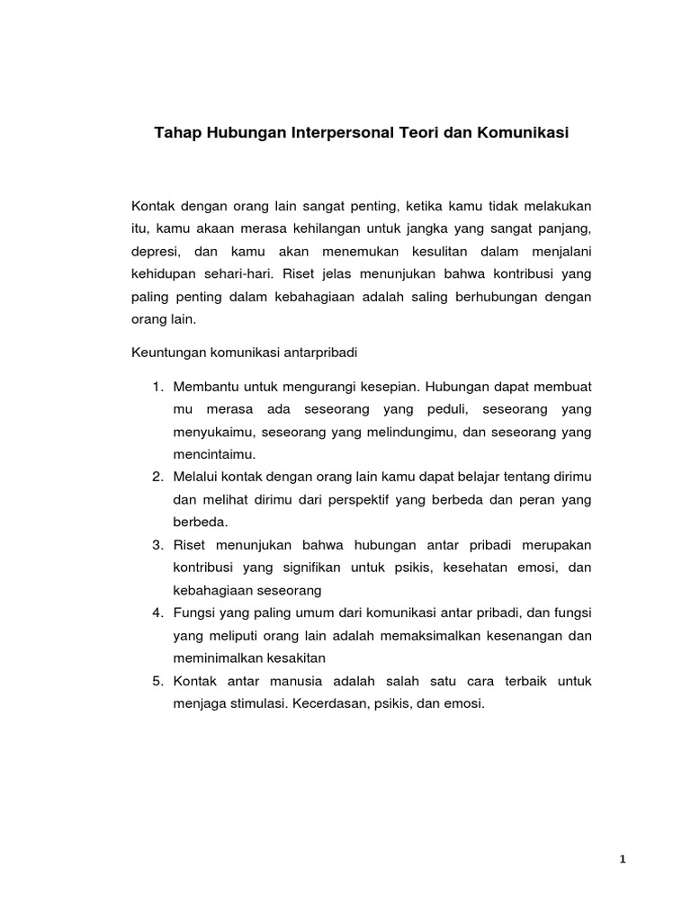 Nellitawati & yektri yurmanita 37. Pandangan bahwa komunikasi mendefinisikan hubungan interpersonal telah dikemukakan oleh ruesch dan bateson (1951) pada tahun dari segi psikologi komunikasi, kita dapat menyatakan bahwa makin baik hubungan interpersonal, makin terbuka orang untuk mengungkapkan dirinya. Mengenalkan jati diri anda kepada banyak orang melalui hubungan interpersonal merupakan cara banyak orang dan juga salah satu cara yang bisa anda gunakan oleh anda sebagai manusia. Hakikat dari hubungan interpersonal adalah dimana ketika kita berkomunikasi, kita bukan sekedar menyampaikan isi pesan, tetapi juga menentukan kadar hubungan interpersonalnya. Kemahiran yg perlu utk meneruskan hubungan antara individu dgn individu lain. Model pertukaran sosial ( social exchange model ). Komunikasi interpersonal menekankan proses berinteraksi (perilaku dan keterampilan) bukan hanya isi pesan. Hubungan dengan orang lain, memulai (interpersonal) dengan sesama Namun jika individu individu yang sama ini dihadapkan dengan hubungan kerja yang berkualitas buruk, dampaknya bisa sama besar namun memiliki arah. Hubungan komunikasi interpersonal dengan kepuasan kerja pegawai di dinas pendidikan. Kepercayaan diri dalam komunikasi interpersonal, komunikator yang efektif haruslah memiliki kepercayaan diri. Banyak masalah berlaku akibat komunikasi tidak berkesan. Komunikasi efektif dalam hubungan interpersonal perawat.